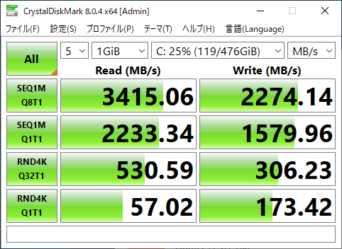 参考までに、自宅マシンのCrystalDiskMarkの結果をのせておく。